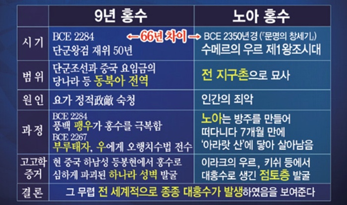 온 천하가 홍수로 멸망할 때 노아의 가족과 방주에 실은 동물만이 살아남았다는 기독교 <구약성서>의 '홍수 설화', 곧 '노아의 홍수'와 수메르 문명의 길가메시 서사시의 대홍수 규모는 전 지구적이라고 되어 있습니다. 초대 단군왕검 때 발생한 9년 대홍수도 거대한 규모였지만, 전 지구적 규모는 아닙니다. <구약성경>의 노아의 홍수, 길가메시 서사시와 동방의 9년 대홍수 때 지구에 사는 모든 사람과 동물이 물난리로 사라졌다는 증거는 단 하나도 없습니다.