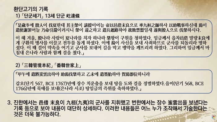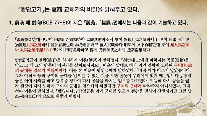 중국 한나라 유향이라는 사람이 편찬한 <설원說苑> 20권 중 <권모權謀> 편에는 상나라(은나라) 탕왕이 포악무도한 하나라의 마지막왕 걸왕을 내쫓고 상나라를 세울 수 있었던 가장 큰 승리의 기반은 구이(단군조선)의 막강한 영향력이었다고 기록하고 있습니다. 유향의 <설원>은 어느 편도 들지 않고 옳고 그름을 판단하지 않았으며 역사를 기록한 여러 책의 내용을 발췌해서 정리한 책입니다.