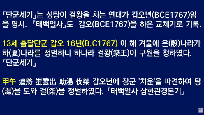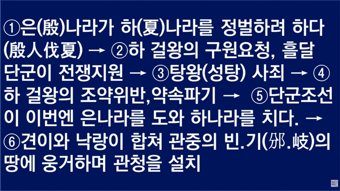단군조선 13세 흘달 단군 재위 16년(BCE 1767) 겨울 은나라(상나라)가 하나라를 정벌하니 하나라 걸왕이 흘달 단군께 구원을 요청합니다. 흘달 단군께서 읍차인 말량으로 하여금 구환(九桓)의 군대를 이끌고 가서 싸움을 돕게 하니, 은나라 탕왕이 사신을 보내 사죄합니다. 어명을 받은 말량은 군대를 돌려 되돌아오는데, 하나라 걸왕이 조약을 위반하고 병사를 보내 길을 막고 약속을 깹니다. 이에 흘달 단군께서 상나라(은나라)를 도와 하나라 걸왕을 정벌합니다.