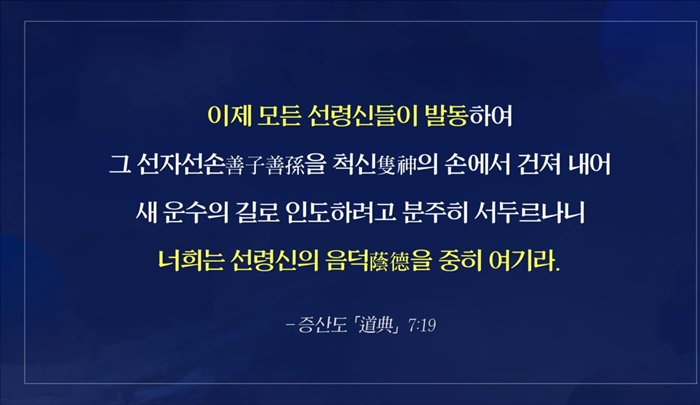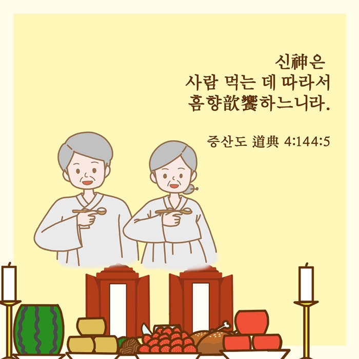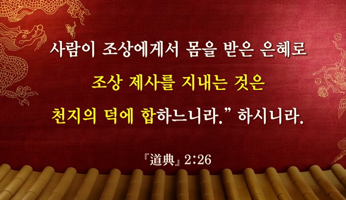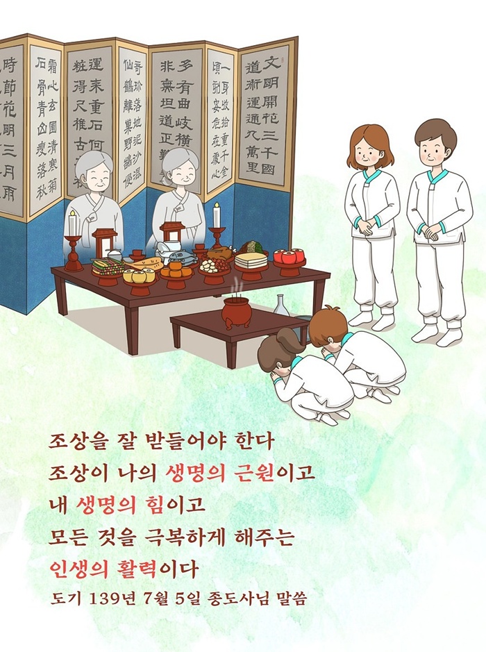 "사람이 조상에게서 몸을 받은 은혜로 조상 제사를 지내는 것은 천지의 덕(德)에 합하느니라."(증산도 도전 2:26:10)라는 말씀처럼 천지 대자연이 만물을 낳고 기르는 가장 크고 인자한 대덕(大德)과 부모와 조상님이 자식을 낳아 기르는 것은 동일하므로 사람으로 태어나 부모님과 조상님께 생전과 돌아가신 후에 예를 다하는 것은 사람의 기본적인 도리이자 인간에게 부여된 절대 의무입니다.