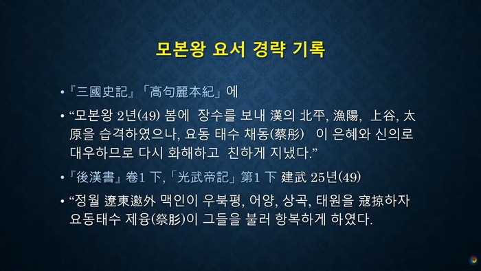 일제 식민사학자들이 '삼국사기 초기기록 불신론'을 주장한 많은 이유 중 하나가 바로 서기 49년 고구려 군대가 북경(베이징) 서남쪽의 산서성까지 공격했다는 기록 때문입니다. <삼국사기> '고구려 본기' 5세 모본열제(재위 48~53)께서 "2년(49) 봄에 장수를 보내 한(漢, 후한)의 북평, 어양, 상곡, 태원 등을 습격하였다. 그런데 요동태수 제융이 이 은혜와 신의로 대우하므로 다시 화친을 맺었다."라고 기록하고 있습니다.