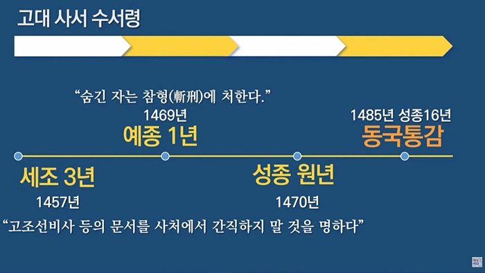 세조는 성공한 내란으로 조선의 제7대 국왕에 올랐지만, 당대 충신과 후대 사람들로부터 역적이라는 오명을 듣고 있습니다. 세조는 나라를 뒤엎은 것뿐만 아니라 우리의 역사와 문화를 기록한 고유 사서까지 거둬들였습니다. 세조뿐만 아니라 예종과 성종까지 수서령을 내렸으며, '닉자처참(匿者處斬)', 곧 숨긴 자는 참형에 처한다'라고 백성을 협박했습니다.
