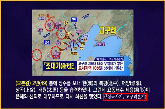 <삼국사기> '고구려본기 - 태조대왕조'는 "3년(55) 봄 2월에 요서에 10성(城)을 쌓아 한나라의 군대에 대비하였다."라고 간략하게 다루고 있지만, <조대기>를 인용한 《환단고기》의 <태백일사 - 고구려국본기>는 요서 지역에 쌓은 10개 성의 위치와 거리까지 구체적으로 기록하고 있습니다. 고구려 5대 모본열제께서 재위 2년(49) 군대를 보내 현재의 북경(베이징) 아래까지 공격한 <삼국사기> 기록은 중국의 정사인 <후한서> '동이열전-고구려'에도 기록되어 있습니다.