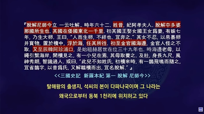 일연스님이 지은 <삼국유사>는 "나는(석탈해) 본래 용성국(龍城國) 사람이요. (정명국(正明國) 혹은 완하국(琓夏國), 화하국(花廈國))이라고도 하는데, 용성은 왜(倭)의 동북 1천리에 있다.)", <삼국사기> '신라본기-탈해 이사금조'에는 "탈해이사금이 왕이 되었다. 이때 나이가 62세였다. 왕의 성은 석씨(昔氏)로, 왕비는 아효(阿孝, 3대 국왕 남해차차웅의 딸) 부인이다. 탈해는 본래 다파나국에서 태어났는데, 그 나라는 왜곡(倭國)의 북동쪽 1천리 되는 곳에 있다."라고 기술하고 있습니다.