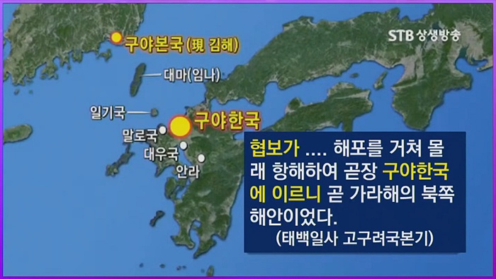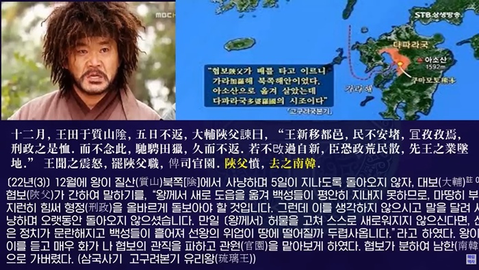 <환단고기의 <태백일사> '고구려본기'는 "협보가 남한으로 달아나서 마한산(現 평양) 속에 은거하고 있을 때 따라와서 사는 자가 수백여 가구였다..... 협보가 장차 변란이 있을 줄 알고 무리를 꾀어 양식을 싸서 배를 타고 패수를 따라 내려왔다. 해포를 거쳐 몰래 항해하여 곧장 구야한국에 이르니 곧 가라해의 북쪽 해안이었다. 몇 달이 지내다가 아소산으로 옮겨 살았는데 이 사람이 바로 다파라국의 시조이다."라고 기술하고 있습니다.