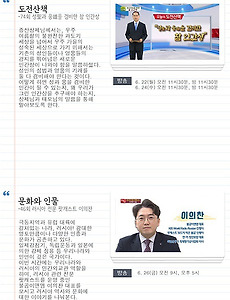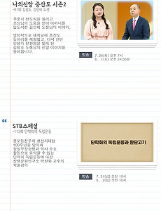 증산도 상생방송 2020년 7월 2주차 주간 tv방송편성표 자연과 문명과 인간의 새로운 삶의 질서 개벽문화를 선도하는 증산도 STB 상생방송2020년 7월 2주차 - 주간 TV 방송편성표2020년 7월 6일 ~ 2020년 7월 12일 새로운 자연의 질서, 새로운 문명의 질서, 인류의 새로운 삶의 질서가 열리는 것이 바로 개벽(開闢)입니다.우주는 우주에 내재한 이법(理法)에 따라 시원개벽(始原開闢)으로 하늘과 땅이 처음 열렸습니다. 천지(天地)가 열린 이래로 우주는 개벽을 통해 생장염장(生長斂藏) 질서로 끊임없이 순환하면서 오늘에 이르렀습니다. 우주가 생장염장의 질서를 바탕으로 사람농사를 짓는 시간의 대주기는 우주 1년의 129,600년입니다. 우주가 인간농사를 짓는 우주 1년의 봄우주에 생(生)의 질서로 만사만물(萬事萬物)이 시작되면서 새로운 종(種)이 출현하고.. 2020. 7. 6.